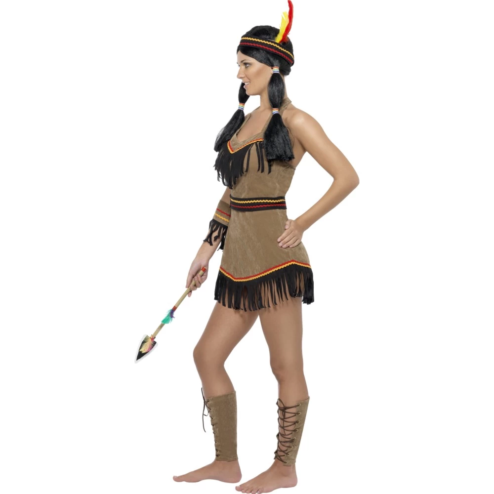 This Native American inspired fancy dress costume is ideal for all fancy dress events, the pretty suede dress is complemented by thrilling black tassels.Â