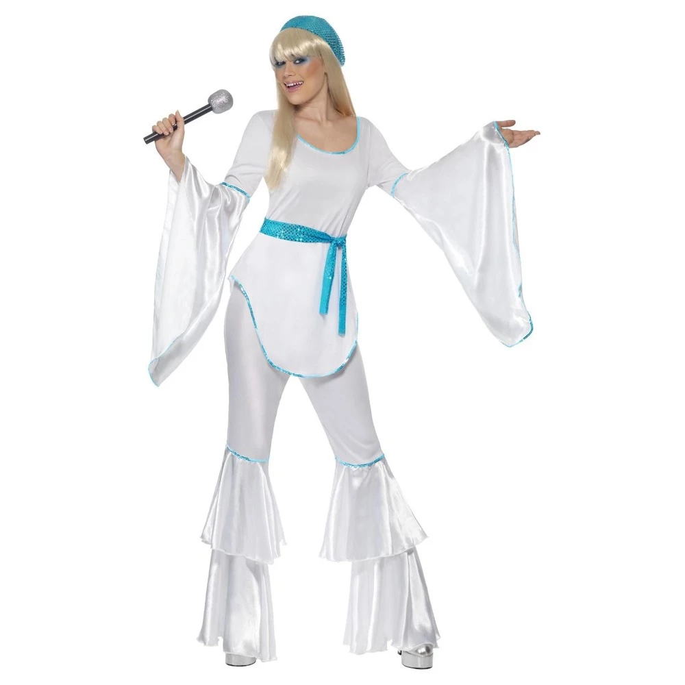 Pay tribute to the Swedish stars with the Super Trooper Costume. This female 70s disco fancy dress costume includes a top, trousers, hat and belt tie.